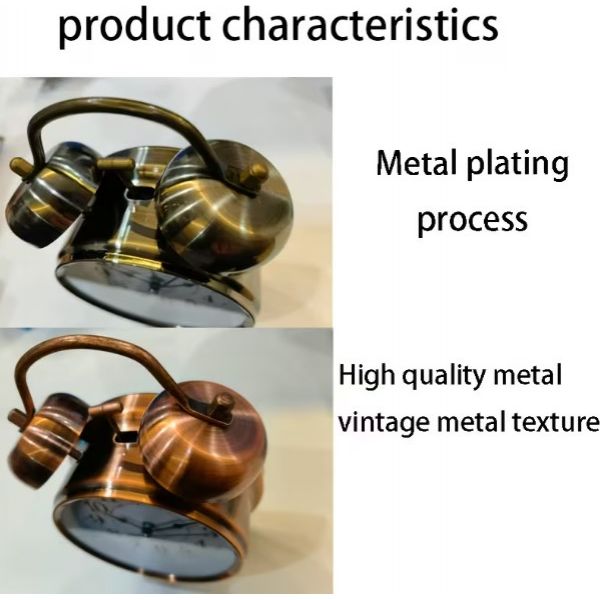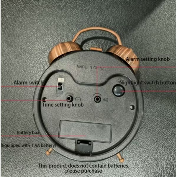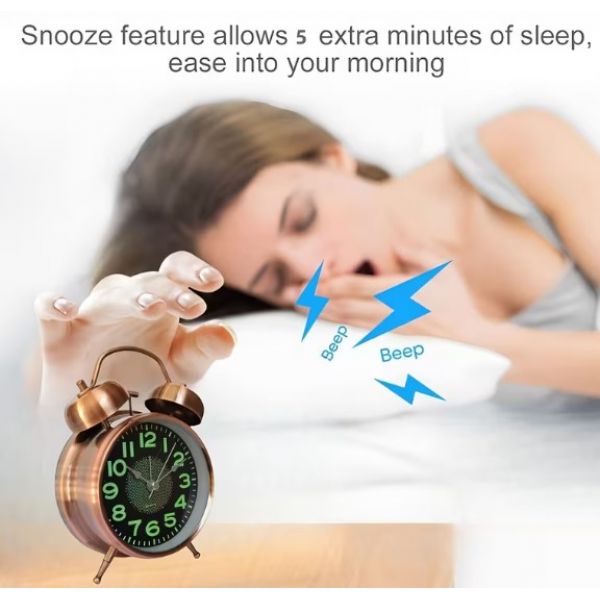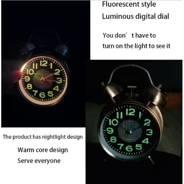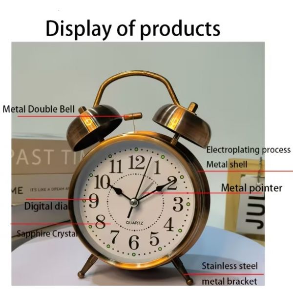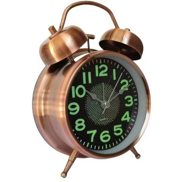 A classic twin bell alarm clock with a loud ringing sound, designed in a vintage metal style. Reliable and easy to use for everyday wake-ups.