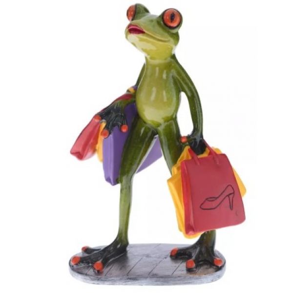 Декоративная фигурка лягушки с пакетами — яркий интерьерный аксессуар с игривым настроением. Образ «шопоголика» с разноцветными сумками делает фигурку запоминающейся и отлично подходит для создания акцента в интерьере.